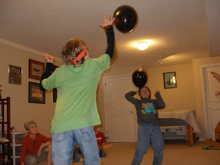 3. Cannonball Pop: Ted had blown up black balloons ahead of time, and Charis attached yarn to them. The boys tied the yarn to their ankles, then had to run around popping other people's balloons. It was hilarious to watch them!